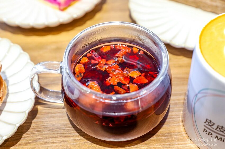 充滿果香的茶品,裡面有洛神花、黑醋栗、蘋果丁、玫瑰果、鳳梨丁、木瓜丁、櫻桃和覆盆子,酸酸甜甜帶有濃郁莓果香氣的熱飲,很適合搭配水果千層蛋糕和檸檬千層蛋糕。