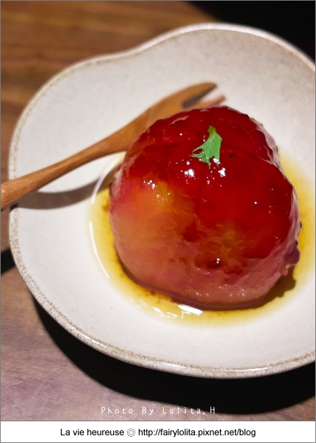 去皮的牛蕃茄,瑰麗色澤看起來十分漂亮,冰冰涼涼的口感中,帶著微香的紅酒味,酸酸甜甜,多汁又開胃!