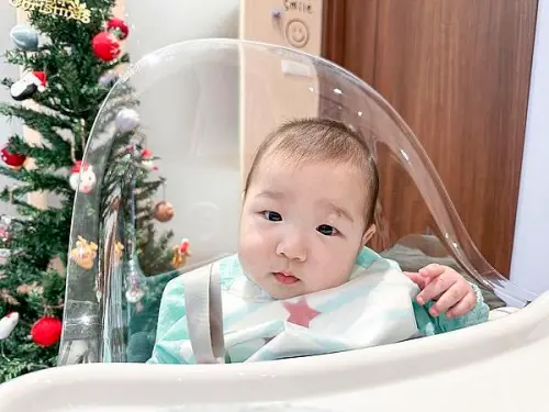 一開始還不太會坐的時候我都讓她坐在月亮澡盆內吃飯