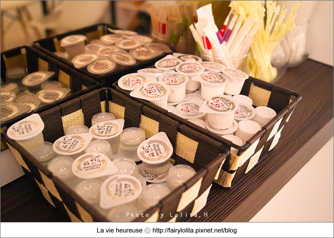 它的店面空間規劃成販賣區及用餐區兩部份,餐點提供了冰、熱飲的服務,店家也很貼心地準備奶精及砂糖供客人們使用:)