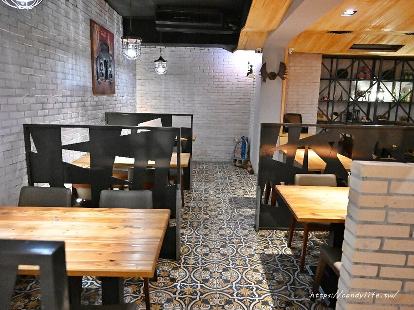 這邊是地下一樓的座位區,美美的復古花磁磚地板、紅磚壁爐,彷彿置身在異國餐廳,空間寬敞舒適,充滿浪漫氛圍