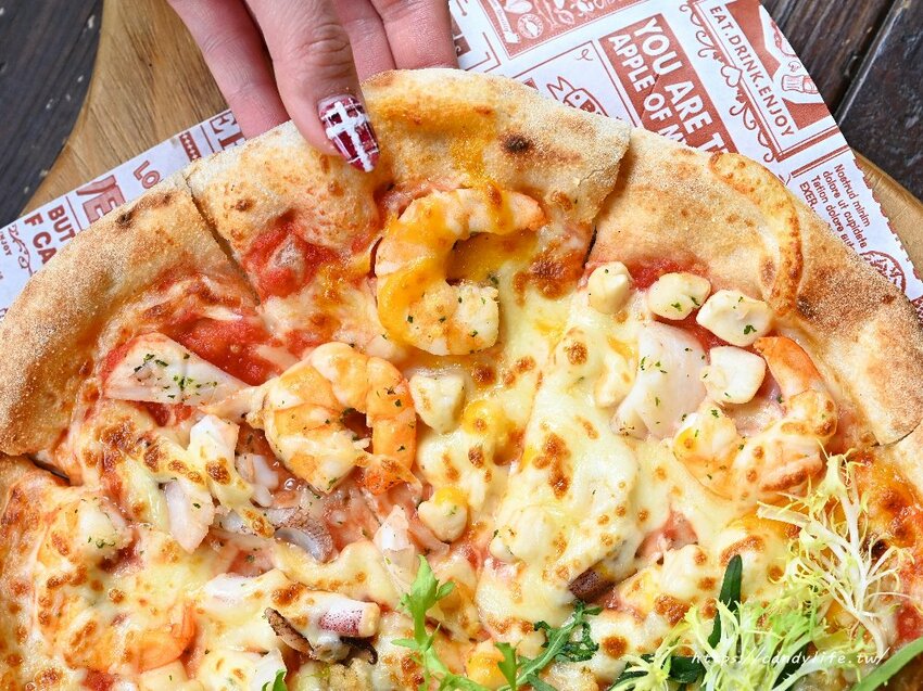 漁夫海鮮的基底是番茄醬,裡頭的海鮮有軟絲、淡菜及蝦仁,搭配香濃莫札瑞拉起司,海鮮用料非常實在,趁熱吃還會勘西呢,這口味糖糖還蠻推的,如果是單純漁夫海鮮披薩還可以選大蒜醬口味唷