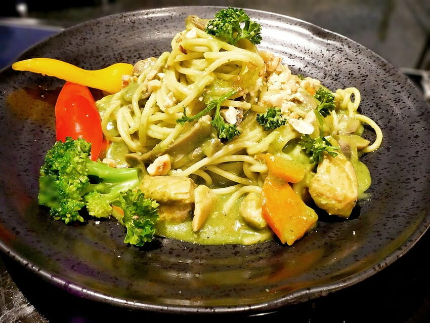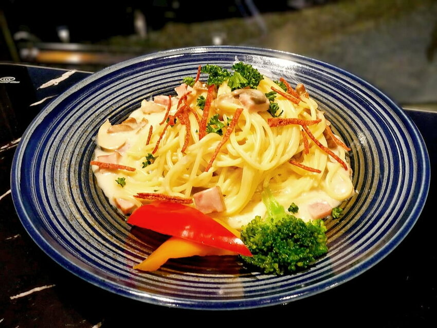 使用燻雞肉加入火腿和洋蔥炒出香氣.再加入新鮮時蔬.最後淋上濃郁的經典奶油白醬.是一盤多層次口感的義大利麵!