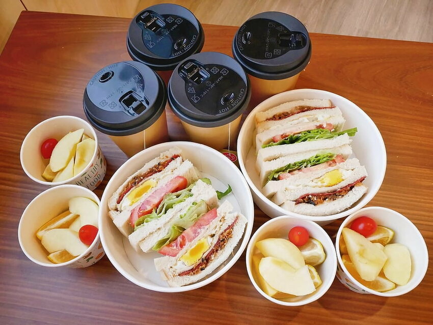 這天的早餐是火腿蔬食三明治+綜合新鮮水果+熱紅茶(冰熱可任選)