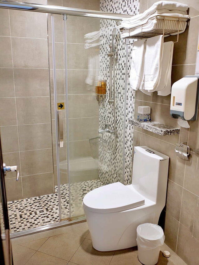 乾溼分離浴室以灰色作為主色系. 給人沉穩的感受.不僅水溫穩定.水量又很足夠. 架上另備有大浴巾和毛巾.滿足每一位旅客休憩的需求