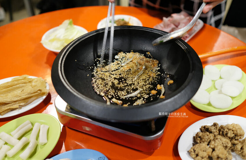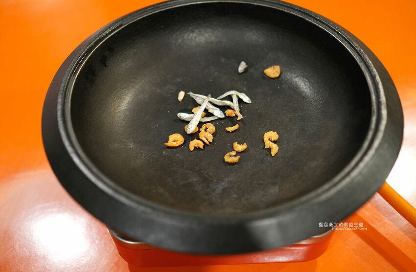 老闆娘會先到桌邊服務,爆香小魚乾、小蝦米、洋蔥絲、麻油、紅蘿蔔、蔥段和大白菜..等等。