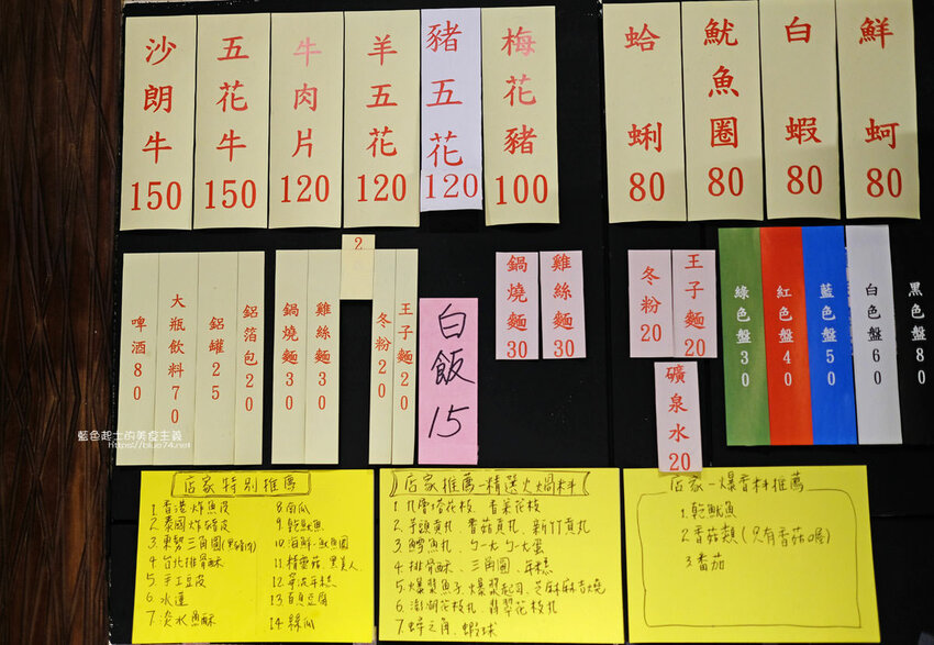 中間是麵類,最右邊是盤子顏色的價格,黑色盤80元、白色盤60元、藍色盤50元、紅色盤40元、綠色盤30元、一人起鍋費30元。