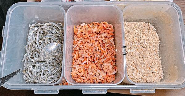 炒鍋的順序:香油、麻油➡️爆香蝦米、小魚乾、柴魚末,放入大白菜、肉類拌炒,中途將半生熟肉類盛起放置一旁