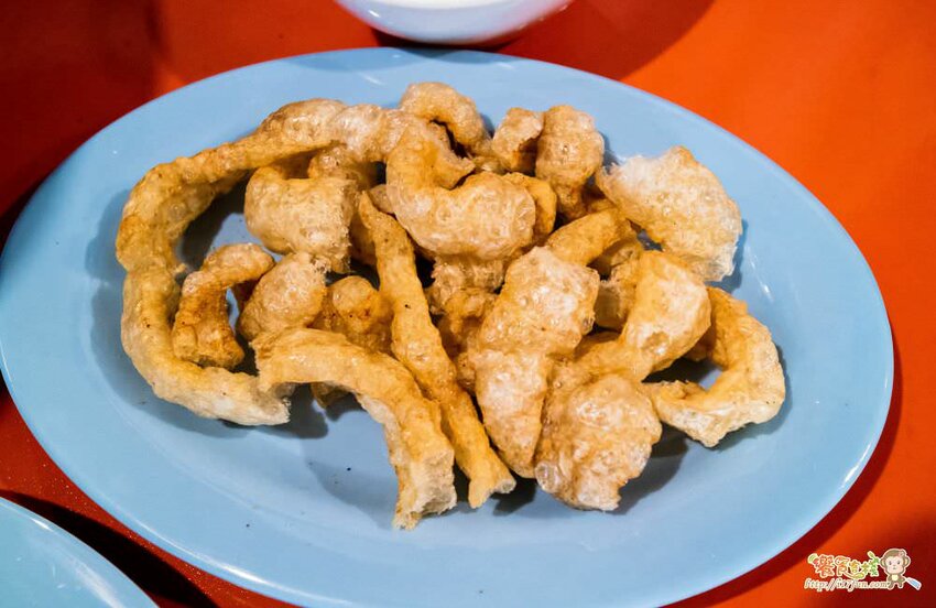 泰國的炸豬皮,也是必點的一道菜,吃法跟炸魚皮一樣,呈現半酥軟的口感最好吃。