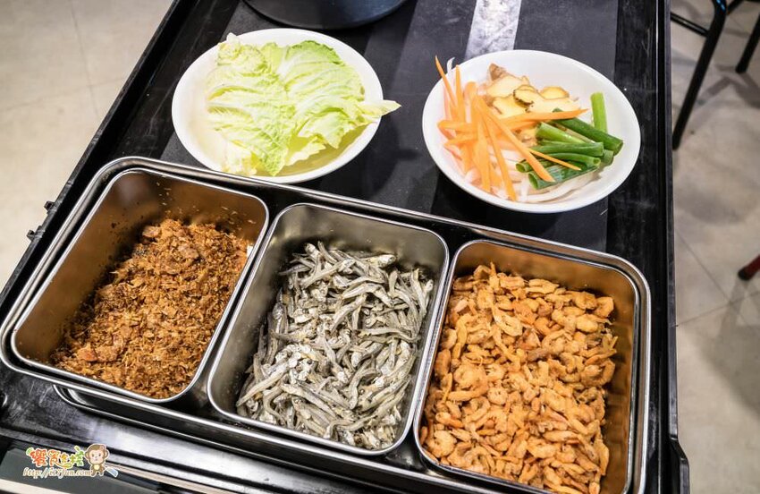 石頭火鍋之所以美味的關鍵就在於爆香及湯頭缺一不可,而食藝石頭火鍋的爆香法寶有別於台中一般的石頭火鍋店,採用扁魚、蝦米、小魚乾先用麻油煸香之後,再放入大白菜、薑、紅蘿蔔、蔥段、洋蔥…等等食材,下去炒到香氣釋放,再倒入店家用雞骨及蔬菜特別熬製的高湯。