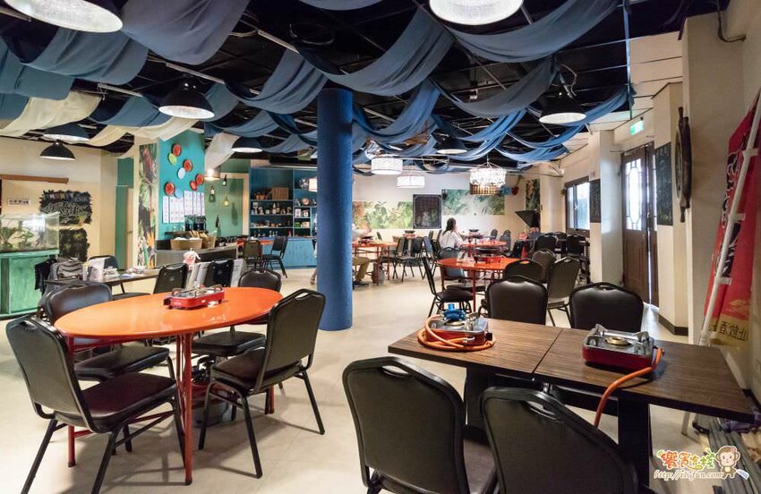 走進店內,這空間非常的寬大且舒適, 以藍色的布幔佈置,搭配上大圓紅桌,老闆應該想要呈現出復古中帶有點浪漫的味道。