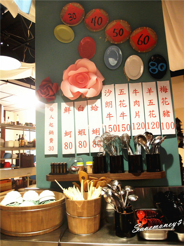 這小黑板上寫的是各種火鍋的價錢,除了豬牛羊,還有牛五花和沙朗牛