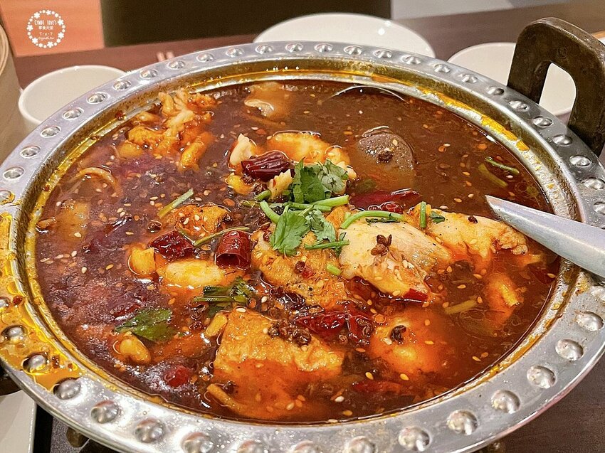 合菜適2人 $1988:韭黃炸春捲+香煎蘿蔔糕+果木爐烤片皮鴨(半隻)+乾鍋藕香炒鴨架+石鍋海鮮豆腐煲+麻辣沸騰水煮魚+櫻花蝦高麗菜。