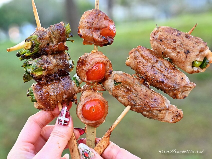 想要來點口感較豐富的串燒,可以點這三串牛五花包蔥、豬五花包番茄或蔥肉串,糖糖還蠻喜歡豬五花包番茄,咬下去還會噴汁呢