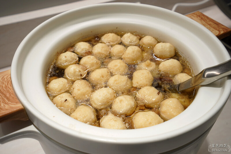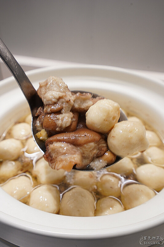 這鍋熱騰騰的湯很特別,表面上是魚丸湯,結果裏面竟然有豬腳耶