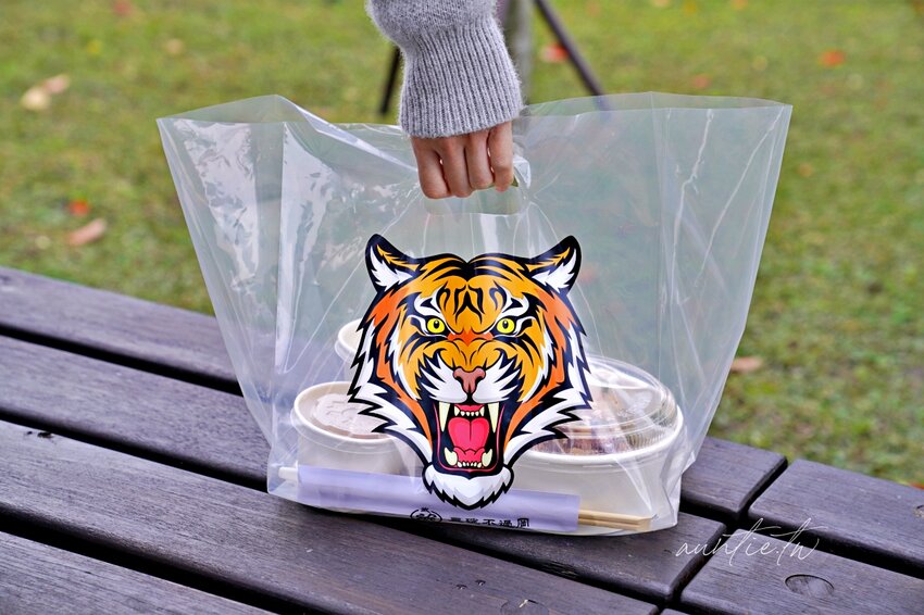 武三碗不過岡的外帶包裝也很有特色,提著的透明袋就像是拳頭打老虎的樣子,光是武松打虎的梗可以弄到包裝上,老闆真的很有創意。