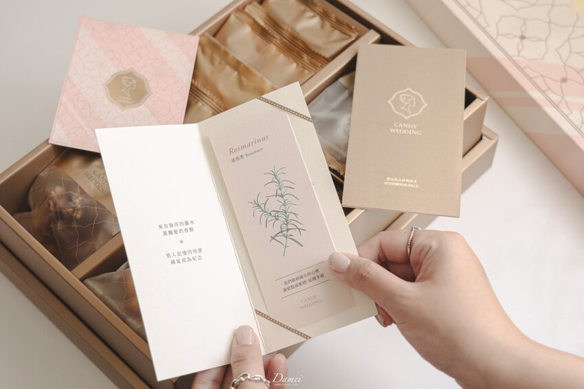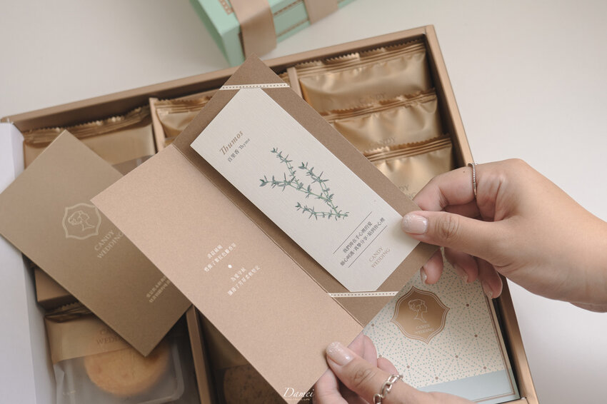 「妳不覺得會寫詩的男生很有魅力嗎?」身邊一位女生朋友曾對我這麼說著,當然我沒辦法理解(笑)不過對於詩集一直都是很喜歡的,擺放在禮盒中的詩籤,根據新人揀選喜餅食材裡所選用的香草植物,製作而成的詩籤,這是百里香,充滿力量的香氣,象徵著活力與勇氣,不僅是我們祝賀新人,同時也被祝福了,本來「愛」就是雙向的呀。