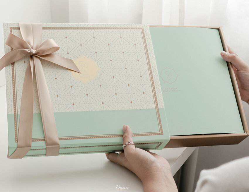 Candy Wedding 提供兩款顏色的禮盒,分別為典藏愛戀系列(湖水綠)與浪漫香頌系列(薄霧玫瑰粉),在典藏愛戀系列共有三種不同的尺寸大小,這次我選擇 M size 一次可放入12-13入的喜餅,當然裡面的甜點都能自由做搭配!讓我覺得很喜歡的是緞帶顏色也提供湖水綠及雅典金兩款挑選,金色搭配起來讓整體視覺十分合拍。