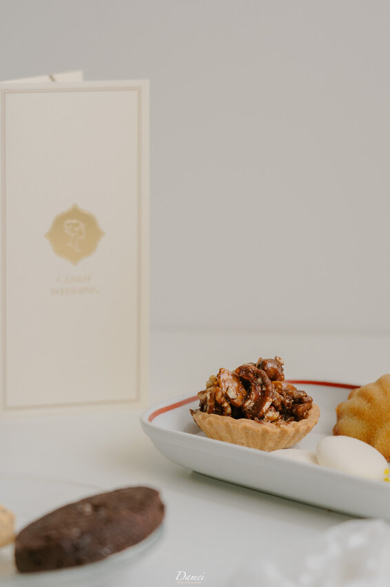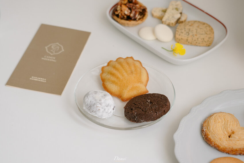 有些新人可能會在意禮盒裡能否放進鹹餅乾,Candy Wedding 提供兩款鹹餅乾挑選,海味辣脆片以干貝醬和蝦米調配一起,鮮甜海味在這塊餅乾都吃得到。我自己頗為喜歡的是伯爵沙布列,不僅一入口就飄出的伯爵茶香,尾韻的奶油香氣四溢,大塊又厚實的沙布列,捨不得吃完它。
