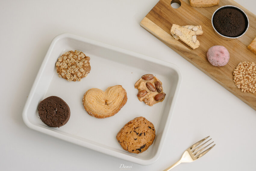 巧克力燕麥脆餅、鹽之花巧克力、蝴蝶千層酥、堅果蛋白餅、蔓蔓玉米脆餅