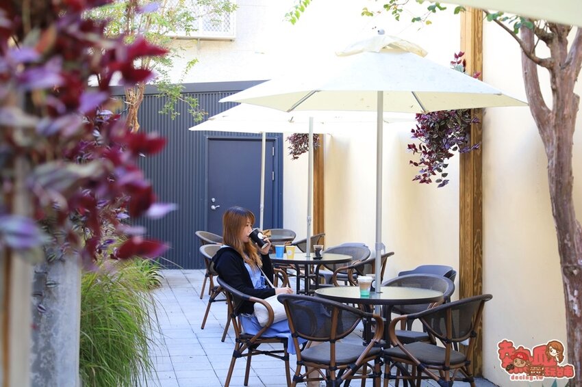 很酷的是「The mocktail Plan」不提供店內內用,反而在店外一側開闢自家咖啡後花園庭園,長廊式的庭園,種植大量的植栽造景,簡約的戶外陽傘座位區,在台南少見但國外非常多,坐在這也會有一種與世隔絕的清幽感呢,這裡到了夜晚,打上橘色燈光,又是一種夢幻的氛圍。