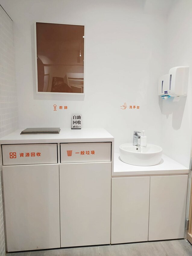 旁邊還有這個廚餘回收區和洗手台,記得吃完飯要把餐盤回收,並作好垃圾分類喔!