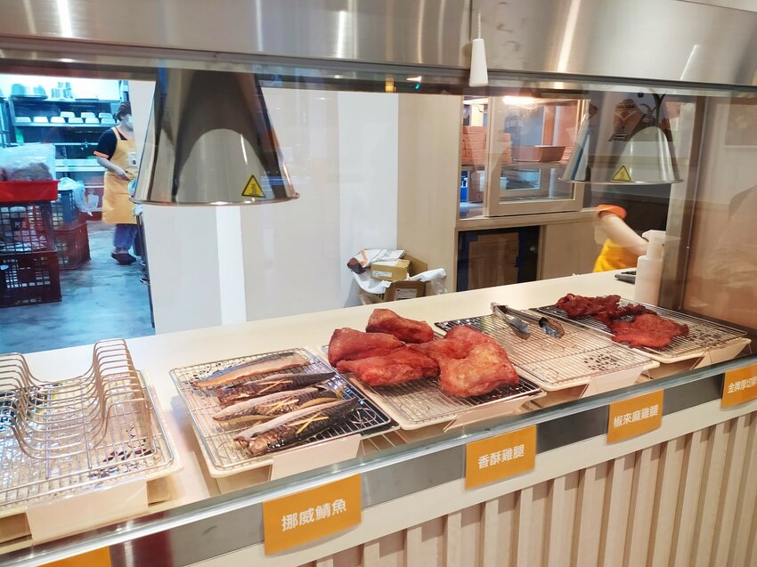 櫃檯旁的鐵盤上擺著剛起鍋的雞腿,鯖魚和排骨,看起來個頭都不小,每道主菜都很引人垂涎🤤
