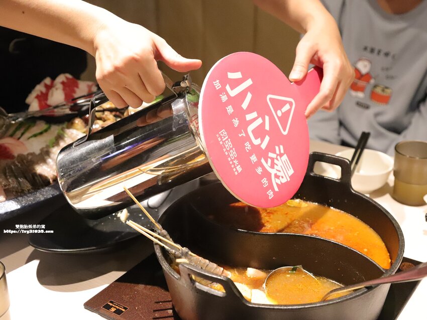 如果覺得火鍋的湯底需要加湯,也會在加湯時,用遮湯板遮住,避免湯汁噴燙到客人。