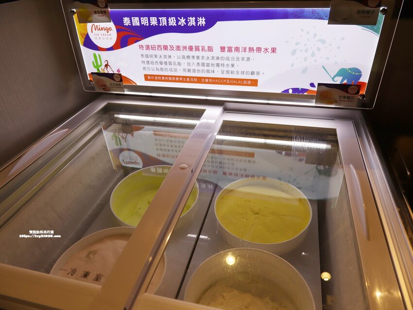 更有泰國明果頂級冰淇淋4種口味可任選,旁邊有甜筒餅乾自取。