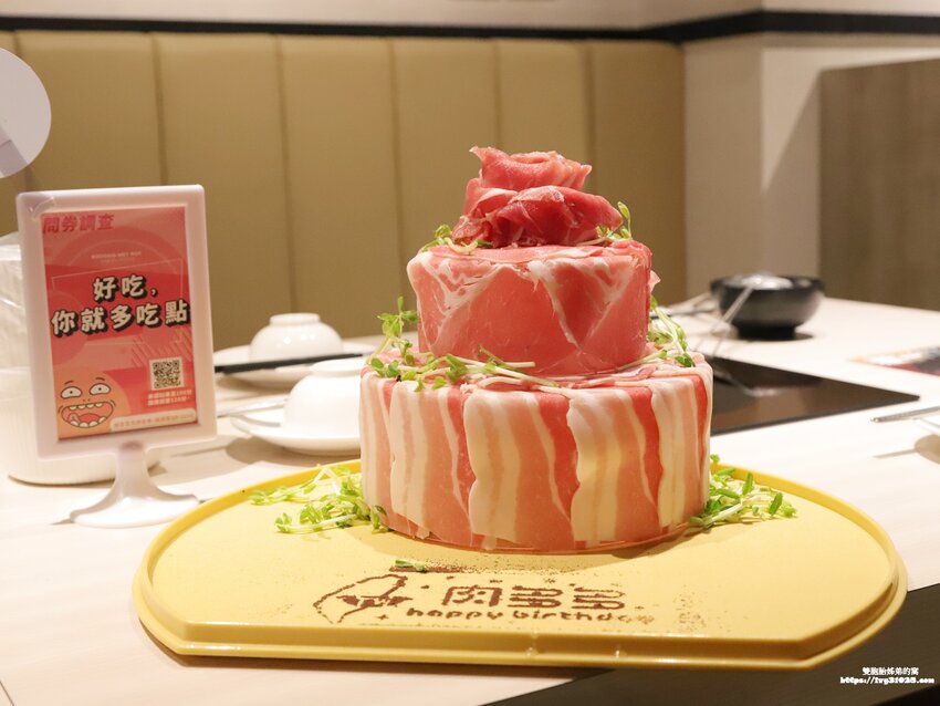 來全台最大火鍋集團 – 肉多多火鍋義大店消費,可以點$499兩層的浮誇肉蛋糕,以美國雪花牛搭配活菌豬堆疊而成,造型完美的到不行,用翠綠色的苜蓿芽來點綴,讓整個浮誇肉蛋糕整體顯得更格外迷人,再用巧克力粉撒畫出 肉多多 三個字,如果沒吃過它,真的不能算你來過肉多多悠~~。