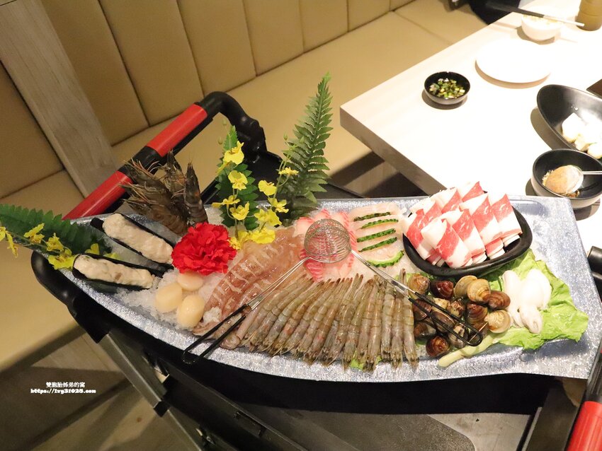 內含小白蝦、蛤蜊、巴沙魚片、小花枝、鮮蚵、透抽、大白蝦、鯛魚片、夙目魚滑、海鮮滑