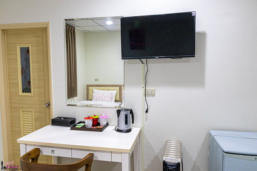 一旁有著衣櫃、小冰箱、熱水壺和書桌。