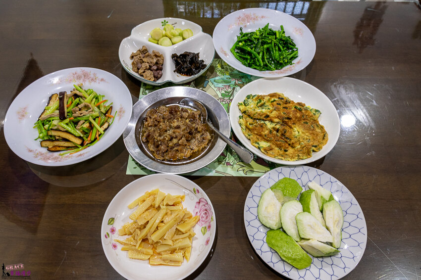 第二天早上最期待的就是民宿主人準備的風味早餐,兩個人用餐竟然準備這麼豐盛,採用的都是自家種的蔬果,韭菜煎蛋超香的,那個醬筍是老闆娘自己醃漬的,每一道都超好吃的。