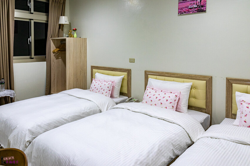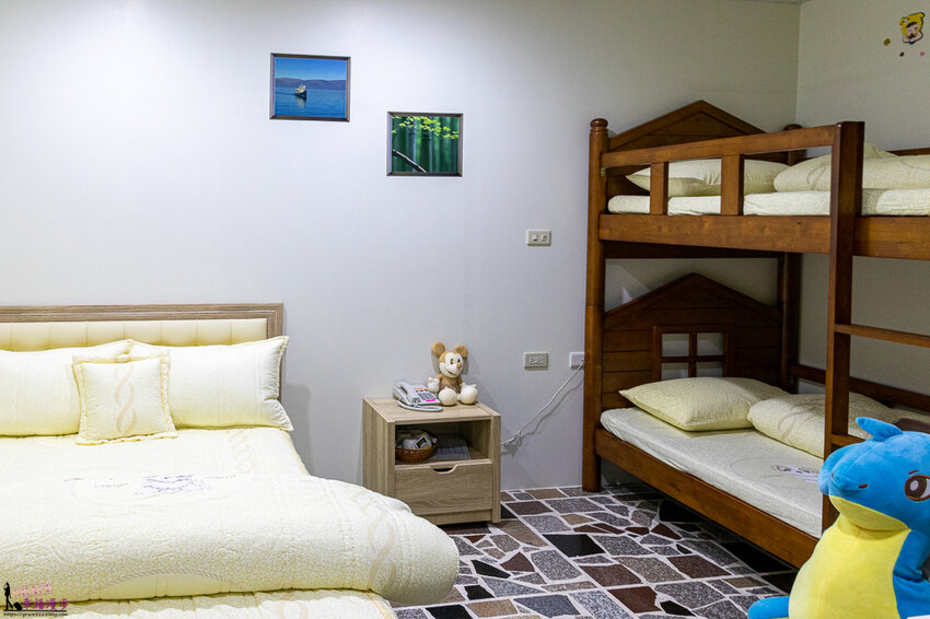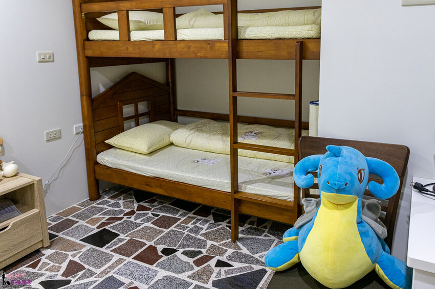 來去參觀一下其他房型,這間是親子房,有放置幾個玩偶增加童趣,床單也精心挑選過整個風格就是溫馨可愛。