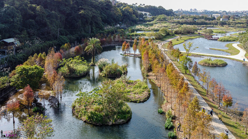 離開山豬湖後我們來到月眉人工濕地生態公園,這裡有幾個人工生態池,其中有一區種植了大約370幾棵的落羽松,空拍後可以看到整個生態池園區真的超美的,這些落羽松是在2019年植樹節時所種植的,這幾年落羽松是很多人追的景點啊!