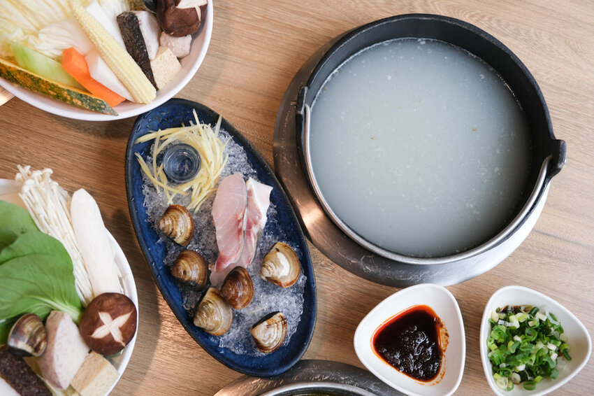 點這個湯頭,還會另附一盤鱘龍魚片、蛤蜊、薑絲及米酒,建議在一開始就全部加到湯頭中煮,會讓湯頭的海鮮味更足。