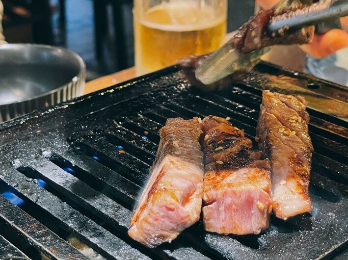 原以為以口味濃淡為進食順序,橫膈膜應該排在最後? 不過兩者都是我的最愛那也就無所謂了…佈滿細筋的牛小排堪稱為牛肉最耐燒烤的位置,即使是全熟都有另一種酥脆的口感!不知道要吃甚麼的時候就吃牛小排一定不會錯,因為怎麼做都好吃.