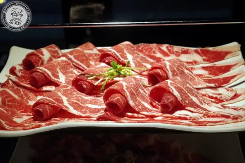 美國霜降牛油花分佈細緻,切的大片厚實,色澤鮮紅誘人,