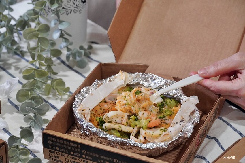 撕開上層的紙包部分超療癒的,滿版的配料全鋪在燉飯上,飽滿鮮蝦、魷魚圈、花椰菜,雙重醬汁交融著香濃莫札瑞拉起司,一打開香氣撲鼻而來,視覺與嗅覺都達到完美的境界。