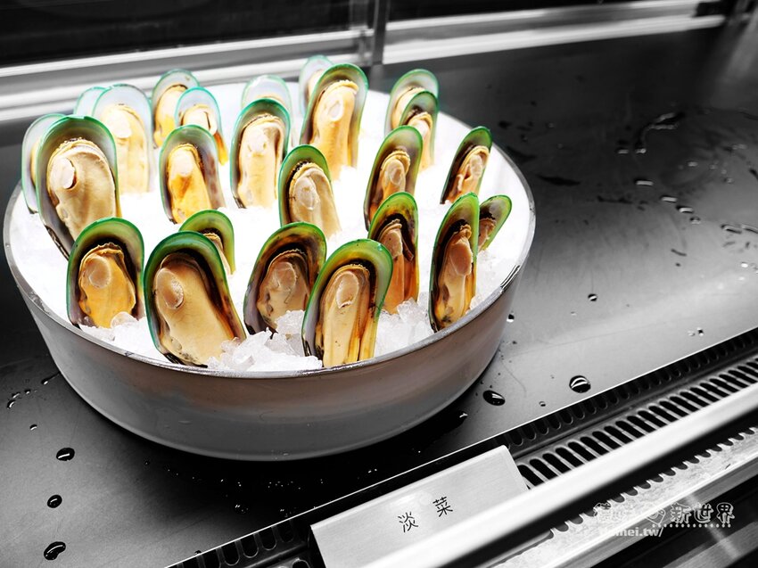 細心擺放很漂亮的扇貝與淡菜,不遠處有白蝦(正巧被拿去補盤)。