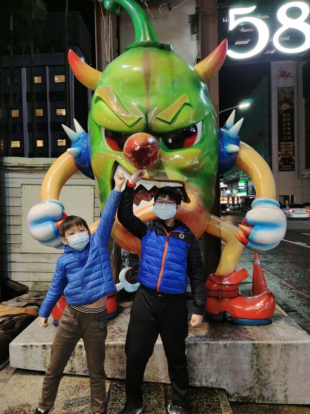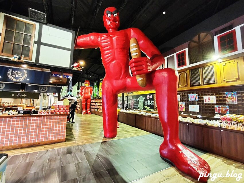 一進門就看到超大隻的巨大的紅色赤魁,後面還有一隻小嬰兒妖怪,真的很有特色也超好拍的!!妖怪上手上拿的就是山寨村著名的惡棍麵包,每次來必買的窯烤大蒜麵包,長有70CM也是一大特色,怎麼吃都吃不膩啊!!