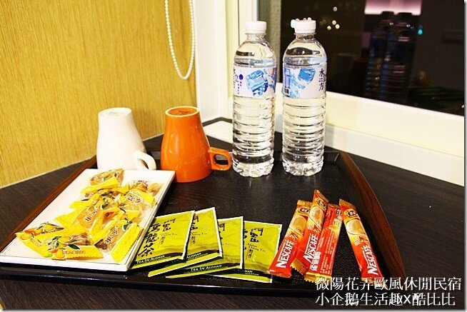 房間內提供茶水及茶包、熱水器,讓旅人在房間裡也能享有來一杯熱飲的愜意!!房間內也備有宜蘭名產金棗蜜餞~還不錯吃XD