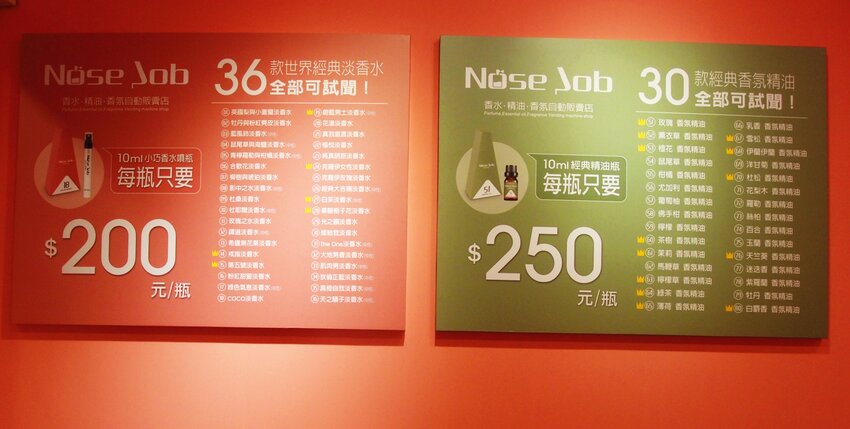 左邊粉橘色總共有36款氣味的淡香水,10 ml $200/瓶, 右邊綠色的是30款氣味的香氛精油,10 ml $250/瓶