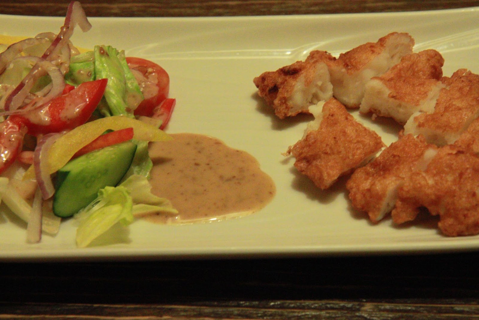 「香煎花枝餅」,這花枝餅可不單純只是用魚漿製成,內餡加了許多花枝塊,口感Q彈搭配香煎的焦酥外皮,好吃!邊盤搭配的是胡麻生菜沙拉,一解擔心吃煎煮料理造成的油膩感。