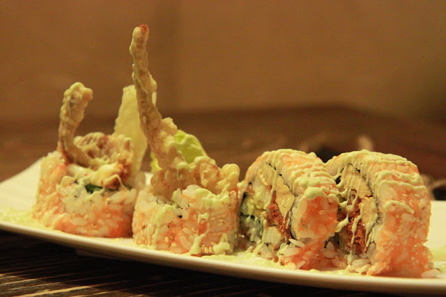 壽司飯表面沾附蝦卵,並且包有美生菜,咀嚼起來有「喀哩喀哩」的 fu,真是太有口感啦!壽司上面的淋醬,是特調沙拉醬,酸甜中帶有黃芥末的香嗆氣味,增加清爽口味,很不錯的一道創意壽司料理!