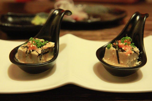 「胡麻豆腐」,口感扎實的手做感豆腐塊,簡單淋上胡麻醬綴以蝦卵、海苔、細蔥,