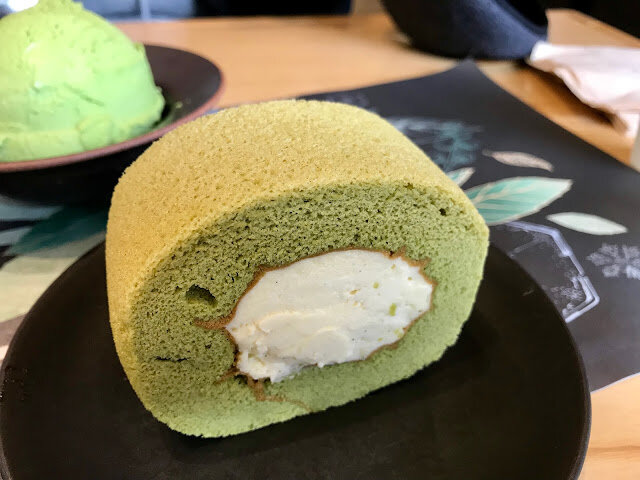 套餐內所附的的餐點包含瑞士捲、熱綠茶和綠茶冰淇淋,