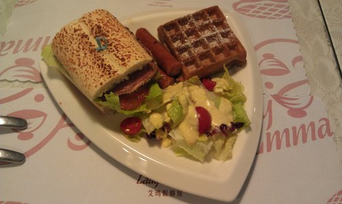 本來是要去明德某簡餐店吃,但因沒注意別人介紹文的寫作時間,去到那時發現已沒那家店,後來本來要去吃薄餅的,但經過這家艾瑪鬆餅屋,因外頭看起來明亮且裝潢的很別緻,吸引了我的目光,所以就進去試試,整體還不錯吃,價位算中高.. 碳烤雞腿:沙拉看起來像凱撒醬,但口味卻不是,有點微嗆辣的口感,還算清爽好吃,鬆餅外皮微酥裡頭鬆軟,吃起來有點孔雀餅乾似的香氣,碳烤雞腿是還不錯吃,但吃不出有碳烤的香氣,有吃到一些小骨頭..