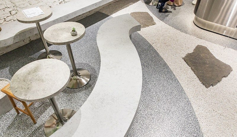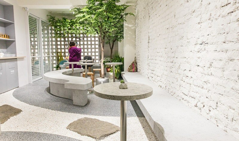 說是小公園風,卻有帶點像是日式庭園的禪風,居然還有枯山水的概念,以白色的砂石代替流水,就像在河岸的小公園吃飯,磨石地板也讓人心情放鬆不少。