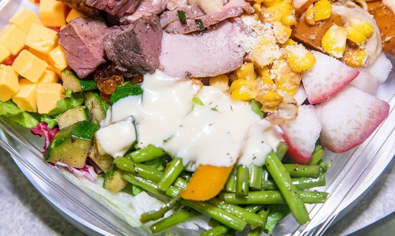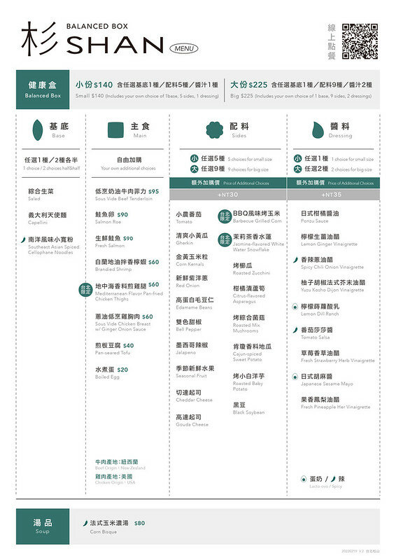 消費方式:小份140元(基底一種、配料5種、醬汁1種),大份225(基底1種、配料9種、醬汁2種),當然都可以額外加購任何一種主食、配料和醬汁,另外還有兩種可以加購的起司,至於湯品則是每日不同(需加購)。
